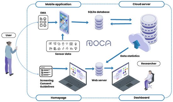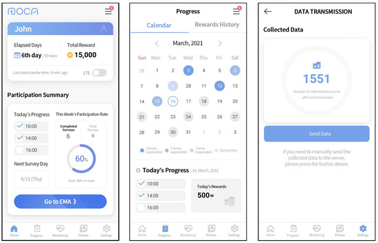 The client application, MOCA, used in this study, was made available free of charge through the research website. We developed the application for both Android and iOS operating systems. MOCA served two main functions: the continuous passive collection of sensor data and the delivery of in situ EMAs [17]. Figure 2 illustrates sample screenshots from the Android version of the application. The initial screenshot shows the application’s home screen, where users monitored the number of days elapsed since the start of data collection, the most recent data transmission to the server, and the daily and weekly progress of EMA responses. The subsequent screenshot portrays the calendar interface, facilitating the review of the upcoming EMA schedule and response history. The last screenshot demonstrates the data-uploading feature, which allowed users to manually send data to the server by pressing a button in cases where automatic transfer encountered issues. MOCA collected sensor data passively in the background without requiring any actions from participants. In this study, we collected a total of 19 passive data sources for Android and 11 for iOS. A detailed description of the data collected from each source, along with their collection intervals for Android and iOS, is provided in Table 2. The data sources and collection intervals vary between Android and iOS applications due to differences in their operating system platforms. Therefore, we analyzed the datasets separately for each platform. The data sources are categorized as either interval-based or event-based, depending on their collection intervals. Interval-based data sources are defined by the application for a specific collection period, whereas event-based data sources are triggered by specific events such as phone unlocking, changes in physical activity, or application opening. Additionally, Table 2 shows which of the data sources were optional for collection, meaning that participants could choose to provide or withhold certain data based on their preferences. The optional data sources included social networking service, stored media, microphone, and camera.