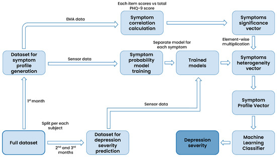 The symptom profile vector () is calculated through element-wise multiplication, also known as the Hadamard product, between the symptom significance vector and the symptoms heterogeneity vector (as shown in Equation (1)). This resulting symptom profile vector is subsequently utilized as input for a machine learning classifier, enabling the prediction of depression severity for the second and third months of data collection (Section 6.2).