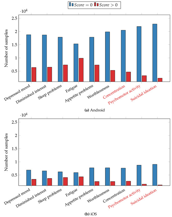 Distribution of samples for depressive symptoms. (a) The Android dataset and (b) the iOS dataset. Symptoms marked in red are excluded from the analysis.