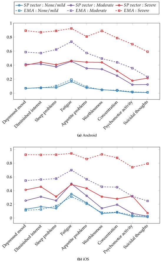 To assess the effectiveness of the symptom profile metric in categorizing participants into distinct depression severity groups, we computed the average values of the symptom profile vector elements for each of the three depression levels. Subsequently, we compared these averages with the normalized scores obtained from the original self-report responses, which range from 0 to 1. The comparison of symptom profile values with original self-report scores offers a perspective on the precision and reliability of our approach in capturing the complexity of depressive symptomatology. Figure 6 illustrates the average symptom profile values alongside the corresponding original ground truth answers for each depressive symptom separately for Android (Figure 6a) and iOS (Figure 6b) datasets. In the figure, solid lines represent the values derived from the symptom profile metric, while dashed lines depict the original scores obtained through EMAs. The color scheme employs blue, purple, and red to indicate not/mildly depressed, moderately depressed, and severely depressed participants, respectively.