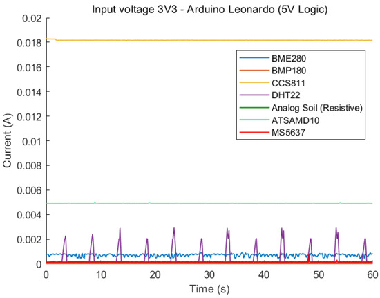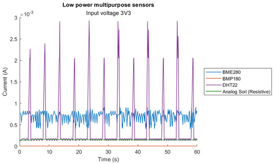 Similarly, the peak current is determined by obtaining the maximum current value over the 60 s period and determining the associated peak power value. The results are shown in Table 6. A closer look at the lower powered sensors can be seen in Figure 3. The DHT22 has clear peaks at 5 s intervals, which correlates exactly with the interval at which the firmware requests sensor values. The peaks represent a significant power requirement when reading sensor data from the DHT22, where the power consumption is up to 10 times that of the average idle consumption while powered. Compared with the BME280, analog soil and BMP180 sensors, the DHT22 is the only sensor which shows noticeable peaks at 5 s intervals, which are associated with the requesting of data from the MCU.