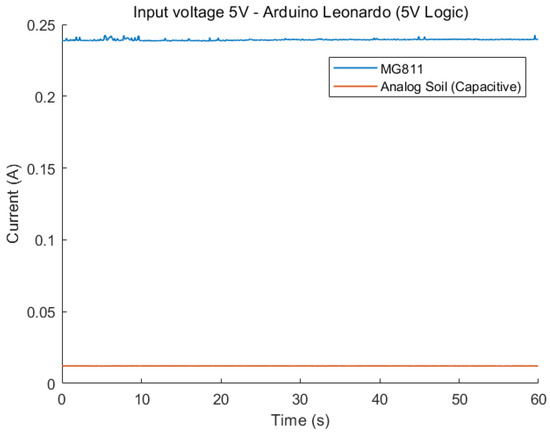 From the data gathered across all sensors, it was evident that there are many suitable low-power options which have a short warm-up time and can be powered on and provide readings within a few milliseconds. The CO2 sensors tended to have the highest power consumption, which is in line with their respective datasheets. Second to that, soil moisture sensors, which are dependent on resistivity of the moisture content of the soil (i.e., how much water is in the soil) had current consumptions which varied by orders of magnitude across that sensor category. For the resistive analog soil moisture sensor, the power consumption was linearly related to the moisture content of the soil—up to a maximum of 0.24 mA or 0.792 mW when submerged in 100% water. The capacitive soil sensor did not vary in power consumption in this way.
