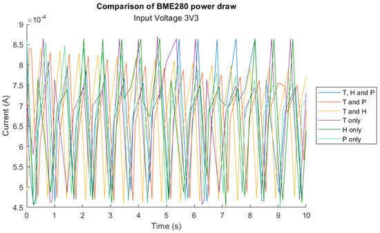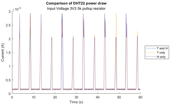 The current draw for the DHT22 and BME280 sensors while measuring one or more combinations of outputs is shown in Figure 4 and Figure 5. The average current and power consumption for each output or combination of outputs are outlined in Table 7 and Table 8.