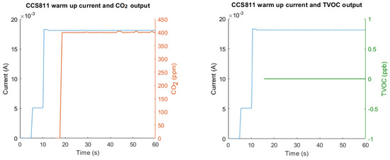 CCS811 sensor warm-up current with CO2 (left) and TVOC (right) output.