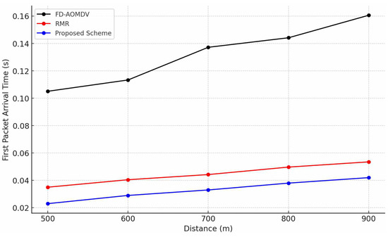 Figure 4 shows the first packet arrival time of each protocol according to end-to-end distance. FD-AOMDV has a slower first packet arrival time compared to RMR and the proposed scheme because they both perform path establishment through RREQ message transmission from a source node that detects the event to the sink node and the RREP reply from the sink node. RMR and the proposed scheme are relatively fast due to the immediate computation and route establishment of the source node and the grid cluster head node without the route establishment process based on RREQ and RREP messages. The proposed scheme exploits a pre-calculated grid cluster structure without complex computation at the cluster head and immediately forwards the packet by branching as multipaths as required to satisfy the end-to-end transmission success ratio. RMR does not exploit RREQ or RREP messages; however, it requires additional computational time to construct multipaths. Therefore, the proposed scheme has a slightly faster first packet arrival time compared to RMR.