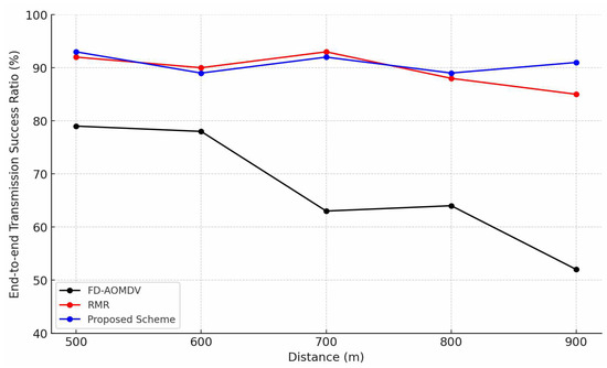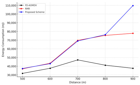 Figure 6 shows the energy consumption of each protocol according to end-to-end distance. Energy consumption is a factor that is directly affected by the transmission and reception of packets between nodes, and the proposed scheme and RMR shows an increase in energy consumption as a result of constructing a large number of paths and forwarding packets as the distance changes. However, as mentioned earlier in the end-to-end transmission success ratio, as the distance increases, RMR no longer constructs a sufficient number of paths when the end-to-end distance exceeds a certain distance, and the total number of packet transmissions is reduced compared to that in the proposed scheme. Therefore, the energy consumption does not increase anymore. In the case of FD-AOMDV, although it might construct a sufficient number of paths as required, the energy consumption is relatively low due to transmission failures caused by collisions and interference during simultaneous transmission over the node-disjoint multipath.