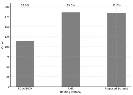Figure 9 shows the end-to-end transmission success ratio when path failure occurs during packet transmission for each protocol. For this purpose, we assume a situation where each protocol constructed a multipath and is ready to transmit a packet. To evaluate the end-to-end transmission success ratio, we calculate the number of packets that arrive at the sink when some nodes in the path are broken during the transmission of 200 packets from the source node. In the case of FD-AOMDV, when path failure occurs, it exploits RREQ and RREP messages to discover the path as in path construction. This results in a lower transmission success ratio until a new path is constructed. In the case of the other two schemes, only the region (or grid cluster) where the packet should be transmitted is specified, and the nodes selected in each transmission process are selected differently according to the criteria of each protocol at each packet transmission. In other words, even if an arbitrary node is damaged, it is immediately replaced by another node in the transmission process and the packet is transmitted. Therefore, both schemes satisfy the required end-to-end transmission success ratio even if path failure occurs.