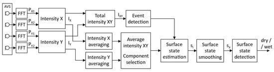 The proposed method of detecting water presence on the road surface using an AVS works in several stages. A general block diagram is shown in Figure 1, and the details of each stage are presented in the following subsections of the paper.