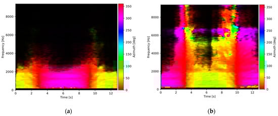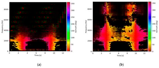 Figure 3 shows the “azimuth spectrograms” calculated for two cases: the dry and the wet road surface. Each plot was calculated for two vehicles moving in the opposite direction. The X-axis represents time; the Y-axis—frequency (limited to 9 kHz in the plots, as there are no important signal components above that frequency). Hue represents the sound source azimuth, and pixel brightness represents the sound intensity level. It can be clearly observed that in the case of a wet surface, there is a significant increase in the sound intensity for frequencies above 2.5 kHz compared to the dry surface state. However, the plots are difficult to interpret because of the presence of components with azimuth beyond the range of interest.