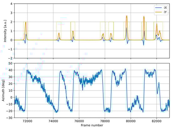 Figure 5 presents an example of the acoustic event detection. The upper plot shows the averaged sound intensity in two axes defining the horizontal plane. Signal parts detected as acoustic events are marked with the dotted line boxes. The bottom plot shows the sound source azimuth. It can be observed that the azimuth changes smoothly during the acoustic events, while between the events, the azimuth changes are uneven and random. The detected events in this example represent single vehicles, except for the last one (at 82,000), which contains two vehicles (two peaks in the intensity and two separate monotonic segments in the azimuth plot).