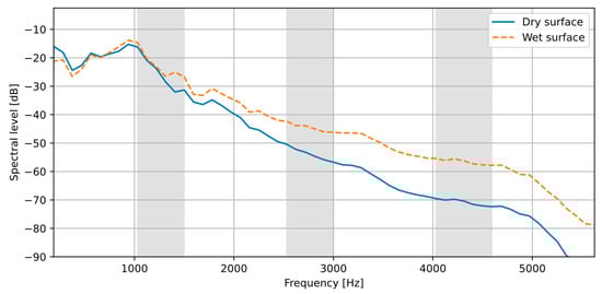 Averaged sound intensity spectra for the dry and the wet road surface. Gray regions indicate the frequency bands used for the surface state estimation.