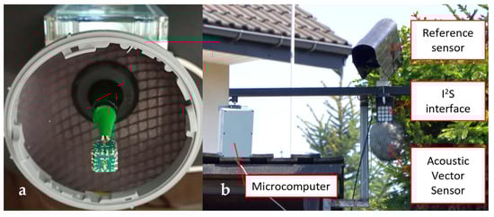 Validation of the proposed method was performed in a real-world scenario using a custom-built AVS. The sensor was constructed from six omnidirectional, digital MEMS microphones (IvenSense INMP441 [23]), with sensitivity −26 dBFS (decibels relative to full scale), providing pressure signals sampled at 48 kHz, with 24-bit resolution, using the I2S protocol. Microphones were mounted on the sides of a cube with an edge length of 10 mm. The microphone signals were received by a microcomputer (Raspberry Pi 4) through an I2S-USB interface. The signals from the sensor microphones were recorded into 15-min-long files (six channels of uncompressed pressure data) and stored on a flash drive.