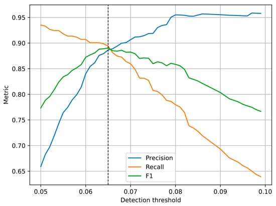 The choice of the detection threshold for the evaluated algorithm was based on the equal precision and recall condition. In a real-life application, the threshold should be tunable so that a desired balance between the precision and the accuracy may be obtained. As expected, increasing the threshold improves the precision, reducing the risk of false negative results, but at the same time, it deteriorates the recall, increasing the risk of false positive results. Decreasing the threshold has the opposite effect. In a practical installation, reducing the risk of false negative results may be preferred so that the threshold value may be increased. It should also be noted that the proposed method achieves above 76% F1 score for the whole range of the tested threshold values 0.05 to 0.10 (Figure 8).
