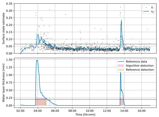 Example of the analysis results, with two periods of rainfall. (Upper plot): surface state estimates si and sa. (Bottom plot): reference data and the “wet surface” detection results. Dashed horizontal lines indicate the thresholds.