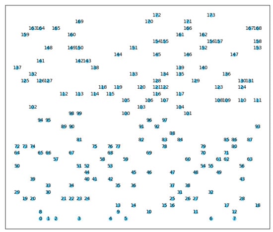Spatial distribution map of secondary users. (We number the secondary users (0–173) in the cognitive radio task region and highlighted them in blue for clarity).