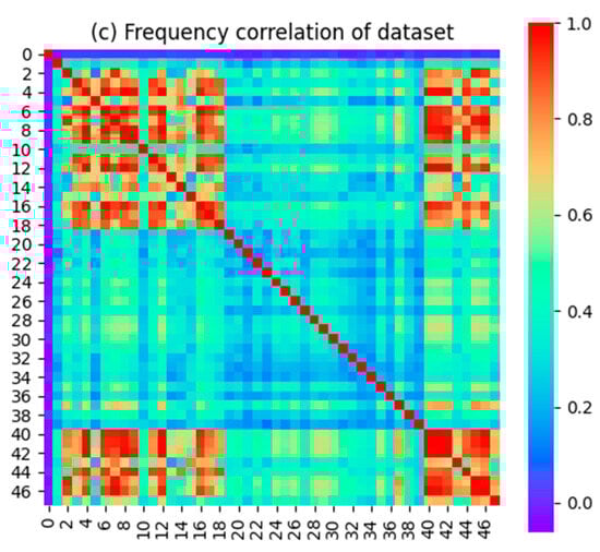 To validate the feasibility of conducting power spectral data prediction experiments using simulated datasets, we calculated the data correlations of individual secondary users in the time, frequency, and spatial domains, as shown in Figure 9. Specifically, Figure 9a illustrates the spatial correlation structure among secondary users, indicating a strong spatial correlation among them. Moreover, the proximity of secondary user indices reflected a stronger spatial correlation between closely located secondary users. In Figure 9b, the time-domain correlation of power spectral data for the same secondary user node across different frequency bands is depicted. It can be observed that the values of time-domain correlation were generally large, and the correlation distribution graph demonstrated the regularity of tidal effects in the spatial activity of the primary user. Figure 9c presents the distribution of frequency-domain correlations between any two time slots of the spectral state on a sensing node in the simulated dataset. Although the numerical values of frequency-domain correlation might not be as close to 1 as those of spatial and time-domain correlation, there were still some significant correlation values in certain frequency bands. The occurrence of windowing effects in the 48 frequency points within the frequency range of 800 to 810 MHz indicated a highly correlated spectral state evolution between low-frequency and high-frequency bands.