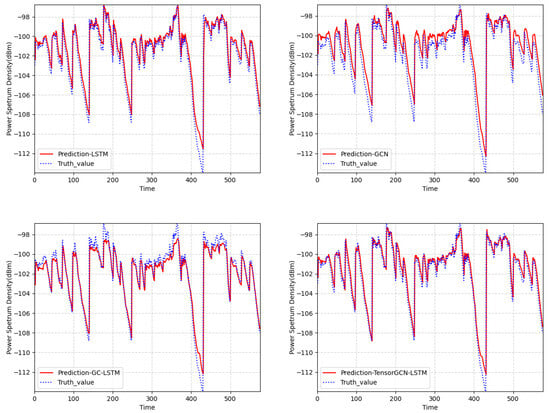 When evaluating the prediction error metrics of the prediction model, we conducted experimental comparisons using the RSS data received at 810 MHz frequency by the secondary user with index 0 () in the spatial domain graph structure shown in Figure 8a. To further explore the temporal variation in the ground-level RSS and four model predictions, we randomly selected the predicted results of 580 consecutive time slots for the secondary user . Figure 10 displays the predicted power spectral density values of four models compared to the true power spectral density values. Generally speaking, the prediction curve of the TensorGCN-LSTM model aligned more closely with the actual trend and was closer to the real data. It can be seen that LSTM better grasped the changing trend of data in the time domain. Meanwhile, the spatial prediction model (GCN) showed a tendency to overestimate the ground-true value, and the spatiotemporal prediction model (GC-LSTM) showed an underestimation of the high values.