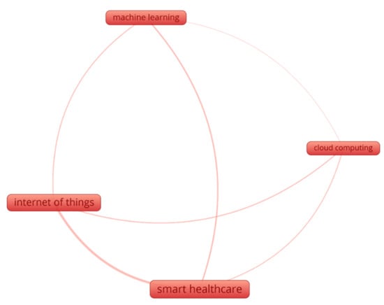 According to KCM, the top three keywords are “IoT”, “Cloud”, and “ML”, with “smart healthcare” appearing in Figure 3. Indeed, it is thanks to these technologies that smart healthcare is already a reality. The strength of the relationships reveals how frequently the terms are used together. All three technologies have several connections to smart healthcare, indicating potential uses for them there. Additionally, link strength analysis reveals that recent research in smart healthcare has emphasized IoT and ML over cloud computing, with the latter receiving less attention.