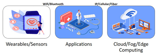Network platforms connect several architectural types, whereas computing platforms are a nexus of more general ideas, such as database management, human–computer interface, machine learning techniques, etc. A “service platform” is a more sophisticated support layer that acts as a barrier between users and technology and could take the shape of call center personnel or automated chatbots [19]. As a result, services can range from straightforward warnings to context-sensitive ones. For instance, contacting an ambulance (based on geographic sensory data) for further paramedic assistance or reporting the number of miles traveled using a wearable sensor. Applications for smart healthcare include telesurgery, monitoring vital signs in intensive care units (ICUs), and fitness tracking in daily activities. Applications fall under two categories: emergency notification systems (ENS) and remote health monitoring (RHM) (ENS). Patients can obtain medical care for tracking symptoms, post-hospitalization care, etc., from home or in a remote geographic location. A recent pandemic (COVID-19) or endemic is just one example of a medical emergency that the ENS warns the general public or groups of individuals about. As a result of the use of mobile devices to facilitate medical follow-up, “m-health”, which utilizes and assesses health statistics, was also established [20].