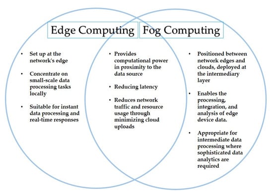 Due to the numerous drawbacks of conventional centralized computing—such as single point failure, excessive latency, energy consumption, etc.—a more distributed and decentralized paradigm for cloud computing has emerged. Although CC does address several problems, such as single points of failure, it is still responsible for concerns with latency and energy use brought on by big uploads to the cloud servers. It became apparent that it would be best to upload only the data that required more processing to the cloud rather than the entire acquisition of data. It would be preferable to carry out operations that require lighter processing locally or very near to the user. Fog and edge computing are concepts that were inspired by this particular idea. This processing idea is shared by fog computing and edge computing. However, they differ technically as indicated by the Venn diagram in Figure 10.