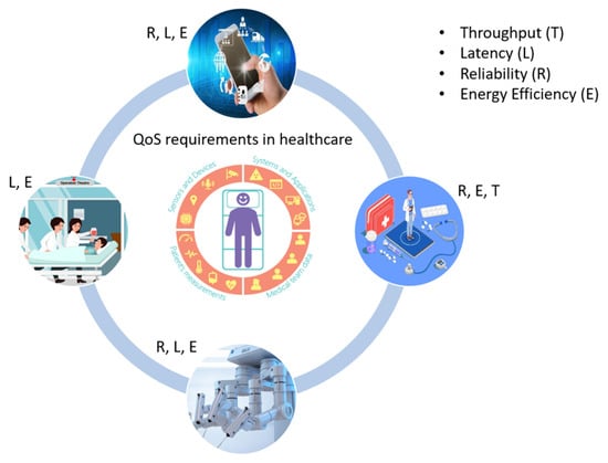 In general, accurate diagnosis, prompt treatment, and excellent patient care define high-quality healthcare services. Technically, the smooth operation of medical monitors and equipment assures the patient that his or her information will smoothly and promptly reach the doctor’s computer. This will guarantee that the patient receives appropriate medical attention on time. This enhances the quality of healthcare service by improving response time and decreasing waiting between patients and doctors in state-of-the-art medical facilities as well as remotely. The quality of service parameters in the wireless link are of utmost priority, which in turn provides improved signal receptions, lowers packet loss ratios, and minimizes power drain. In addition to this, distributed AI services and IoT data present several QoS challenges, like battery lifetime, delay jitter, etc.