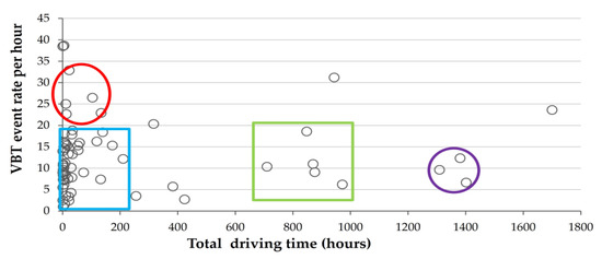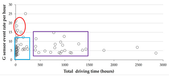 Figure 1 shows that most participants (70%) drove for up to 250 h and had a range of 2.25–12.3 events per hour (left, blue rectangle). A small group of five drivers drove for only 15 to 110 h and had the highest mean event rate of 15–22 events per hour (red oval). The 25% of participants who drove 400 to 1500 h had a range of 3.6–15 events per hour (large purple rectangle).