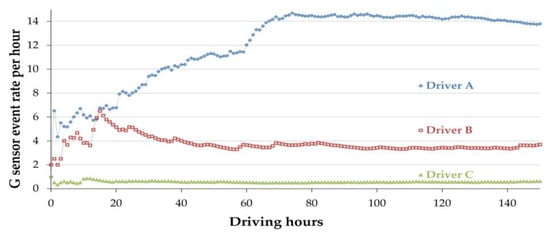 Mean event rate for three drivers (G-sensor data). Driver A’s rate peaks at around 70 h, with a 14 events/hour rate. Driver B starts at a 6.5 events/hour rate, stabilizing to a 3.5 events/hour at 50 h, representing most participants. Driver C stabilizes at a lower 0.5 events/hour rate, below the sample’s average.