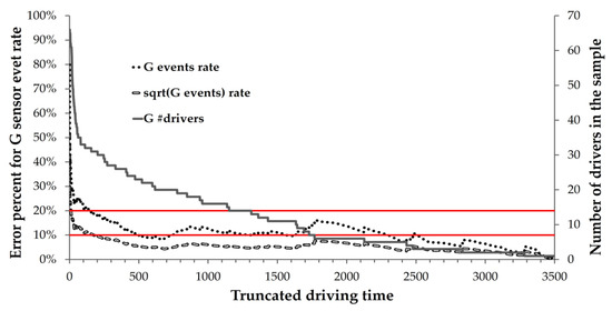 According to Figure 5, when the sample of the G-sensor event rate (the dotted line) is truncated at x = 100 h, the expected error of the event rate is ~21%, i.e., relatively high and less reliable. Even when the sample is truncated at x = 300 h, the expected error is ~15.4%, still higher than desired. To reach an expected error of precisely 10%, a collection of ~500 h of G-sensor data is needed.