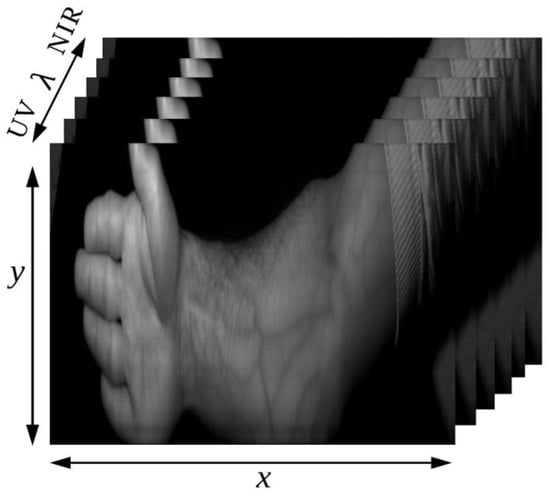 In recent years, hyperspectral imaging has been increasingly utilized in medicine. In biomedical applications [1,2], the noncontact, nondestructive diagnostic technology that relies on hyperspectral imaging is an emerging approach with a wide potential as a noninvasive diagnostic and prognostication technique. At definite wavelengths, biological tissues with different chemical content and physical characteristics have different reflectance and absorption, leading to different characteristic peaks and dips in their spectrum. An analysis of spectral signals provides an instrument for extracting qualitative and quantitative information about the tissue condition. Meanwhile, various tissue pathologies can be visualized by analyzing spatial distribution information provided by hyperspectral imaging, which diagnoses the tissue pathology. Hyperspectral microscopy enables the analysis of biological samples by acquiring spectral information at each pixel [3]. In medicine, hyperspectral visualization has been increasingly used for disease detection, in vitro diagnostics, surgical guidance, scientific research, and so on. There is also a non-medical use where obtaining a high-contrast image of hand blood vessels is important, namely, in-person identification methods [4,5,6,7]. Hyperspectral imaging can find the best contrast between the skin and blood vessels located 3–5 mm below the skin in the near-infrared (NIR) range [8].