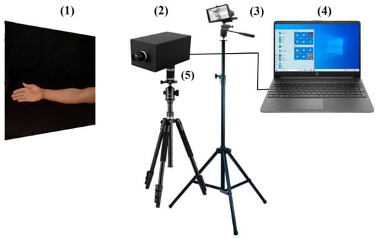Schematic view of an experimental setup (1)—forearm region, (2)—hyperspectrometer, (3)—light source, (4)—the computer with image and signal preprocessing, and (5)—pulsed step motor connected to the camera.