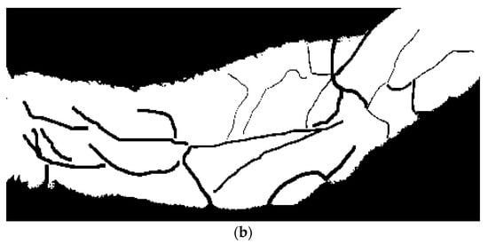 Marking of blood vessels in images. (a) A hand image with marked major vessels and (b) a reference binary image.