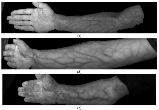 Index images three-wavelength (λ1 = 714 nm, λ2 = 738 nm, λ3 = 882 nm) of hand vessel patterns for participants from different races derived using Formula (5): (a) dark skin (African), (b) fair skin (Caucasian), (c) light brown with slight tan (West Asian), (d) fair skin with slight tan (Caucasian), and (e) dark brown (Central Asian).