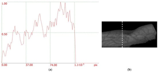 (a) An example of an image vertical profile used for calculating an average blood vessel contrast drawn along the line in Figure 6c; (b) fragment of a section (the dotted line represents the location where the brightness cross section was measured).