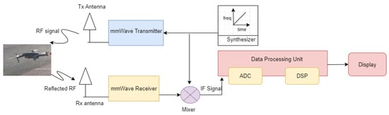 Currently, mmWave radars have become ubiquitous, with a wide variety of applications. The types of components in mmWave radars are shown in Figure 1. The synthesizer generates the chirp, the transmitter transmits this chirp signal, the transmitted chirp is reflected off the objects in front of the radar, and the reflected signal is received via the receiver antenna. The RX signal and TX signal are mixed to generate the resultant IF signal. By processing the IF signal, all the key parameters can be estimated. When multiple objects are in front of the radar, one Tx chirp generates multiple reflected chirps from different objects, and the IF signal will have multiple tones corresponding to each of the reflections. The purpose of the analog-to-digital converter (ADC) is to digitize the IF signal. Fast Fourier transform (FFT) is performed on this digitized IF signal to obtain the range profile.