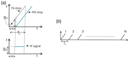 Figure 2. (a) IF signal and (b) chirp frame [12].The time delay can be measured as:where R is the distance to the detected object and C is the speed of light.The initial phase of the IF signal isThe range is computed as:The maximum range is decided via the sampling frequency of this IF signal. The larger the sampling frequency, the better the maximum range capacity of the radar will be. The other deciding factor for the maximum range is the transmission power. There is no hardware constraint on the accurate range estimation of multiple targets. One TX antenna and one RX antenna are sufficient.Another fundamental limitation for maximum range comes from the transmitting power:where is output power of device; is the TX antenna gain, is the RX antenna fain; is the radar cross-section of the target (RCS); is total measurement time; SNR is the signal-to-noise ratio; k is the Boltzmann constant; and T is antenna temperature. - Velocity—mmWave radar estimates the velocity of multiple targets using the phase difference between IF signals, as illustrated in Figure 2b. There is no hardware constraint for the accurate velocity estimation of the multiple targets. One TX antenna and one RX antenna are sufficient.The phase difference is derived as = /, where is the chirp duration time. The velocity is computed as:The measurement is unambiguous only if || < . We can derive that vs. < /4.The maximum possible velocity estimation depends on how fast chirps can be transmitted.