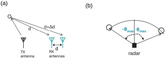 Figure 3. (a) Two antennas are required to estimate AoA and (b) maximum angular field of view [12].The phase difference between the IF signals of the two receivers is derived as:Under the assumption of a planar wavefront basic geometry R = d), where d is the distance between the receiving antennas. The angle of arrival is computed fromThe unambiguous measurement of the angle of arrival requires that () < .This leads to: - Range resolution—The shortest distance at which two objects can become close while still being detected as two distinct objects via radar. The smaller this distance, the better the resolving capability of the radar will be. A radar with greater RF bandwidth gives better range resolution.The smallest frequency differences of an IF signal are related to the chirp duration, .where is the observation interval or chirp duration.Range resolution depends only on the RF bandwidth swept by the chirp.where C is the speed of light, and B is the radar bandwidth. For example, a bandwidth of 4 GHz gives a range resolution of 3.75 cm.