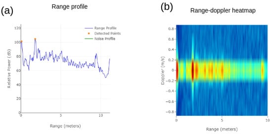 A sample range profile measured using the millimeter wave radar sensor is illustrated in Figure 4a. Taking the fast Fourier transform (FFT) of an intermediate-frequency signal yields the range profile. This range profile depicts the relative reflected power from the targets as a function of range. The target is indicated via the peaks in the range profile. Targets with a large cross-section reflect more power, producing a stronger peak. Targets located near the radar produce a strong peak in the range profile.