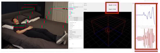 Medical applications for mmWave radars have also gained importance due to their sensitive detection capability and the penetration of mmWave signals in biological tissues. Using mmWave radar, various glucose concentration levels in blood samples to distinguish the healthy or diabetic have been studied in [81]. In [82], contactless breathing rate and heart rate monitoring of patients using mmWave were implemented, as shown in Figure 9. mmWave radar sensors have been used for monitoring vital signs via non-contact means in a robust way [83]. The use of mmWave radar in real-time human motion behavior detection is presented in [84]. The recognition of multiple patient behaviors has been simultaneously studied utilizing mmWave radars in [85]. The real-time detection and tracking of human skeletal positions for patient monitoring is studied in [86]. Considering body movements as micro-motion parameters for real-time fitness tracking via non-contact means has been studied in [87]; additionally, fitness tracking by classifying and counting exercises is presented in [88]. The detection of sleeping pose identification utilizing mmWave radar has been implemented in [89]. For skin diagnosis applications, mmWave radar has been utilized in [90]. The utilization of a wearable radar sensor for continuous blood pressure monitoring is presented in [91]. Detailed medical applications utilizing mmWave radars are tabulated in Table 8.