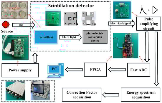 The system of radiation signal detection unit consists of a detector, signal amplification circuit, and 60 MB/s pipeline high-speed analog-to-digital converter (Fast-ADC, FADC), Field-Programmable Logic Gate Array (FPGA), and host computer software Corso v1.0. The energy spectrum acquisition system consists of a detector, a multichannel analyzer, an oscilloscope, and a PC. The schematic diagram of the experimental setup is shown in Figure 2.