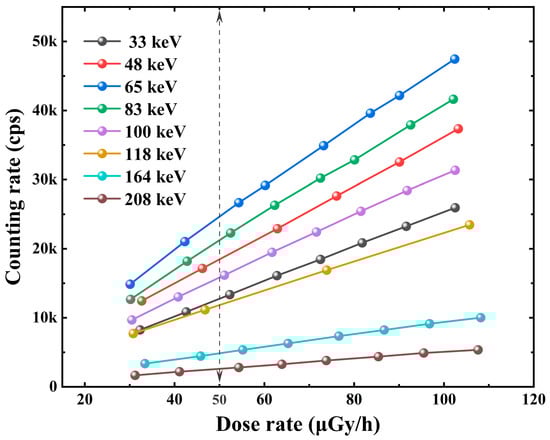 The acquisition energy spectrum unit consists of the multi-channel analyzer ORTEC EASY-MCA-8K and the accompanying software MAESTRO for Windows Version 7.01. To realize the signal of the received sensor, AD conversion of the pulse amplitude signal, and classification to obtain the pulse amplitude spectrum, the acquisition threshold, number of channel addresses, acquisition time, etc., can be configured within the software. To avoid the influence of the system dead time on the experimental results, the dose rate point chosen for the experiment should be within the dose rate linear response region of the detector [18]. The linear response between the dose rate and counts per second of the Cs3Cu2I5:Tl detector at different energies was tested by placing the detector at the reference point position of the radiation field and varying the dose rate by adjusting the magnitude of the tube current of the X-ray machine. As shown in Figure 5, the Cs3Cu2I5:Tl detector has reasonable linearity within about 50 μGy/h dose rate. Therefore, we chose the radiation field with a dose rate near 50 μGy/h to carry out the energy response experiment in this work.