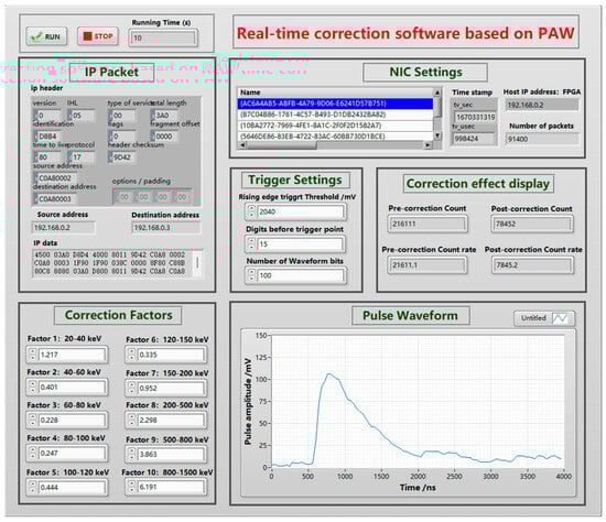 The signal acquisition part of the energy response real-time correction device uses the Xilinx Spartan6 series high-performance FPGA to process the digital waveform data output from the AD9238 and send the data to the host computer via Gigabit Ethernet. The energy response real-time calibration software was written in LabVIEW Version 2015. The program includes three modules: a digital waveform data acquisition module, a Gigabit Ethernet data splicing module, and an energy response real-time correction module. The input of the digital waveform data acquisition module was connected to the SiPM readout circuit to convert the pulse voltage signal output from the detector into digital waveform data, extract the waveform amplitude value, and transmit it to the PC. The Gigabit Ethernet data splicing module was used to transfer data from the energy response real-time correction program to the digital waveform data acquisition module to achieve real-time energy response correction. The real-time energy response correction module was used to process the shape amplitude information extracted from the digital waveform data acquisition module, perform energy response correction, and display the counts or counting rate (including the actual and corrected values) in real time. These enable digital waveform data acquisition, amplitude extraction, energy response correction factor setting, and count displaying. The front-end interface of the upper computer software is shown in Figure 6. The software allows real-time adjustment of correction coefficients, set of trigger thresholds, real-time monitoring of pulse waveform signals, and real-time display of actual and actual counting rates, corrected counts, and corrected counting rates.