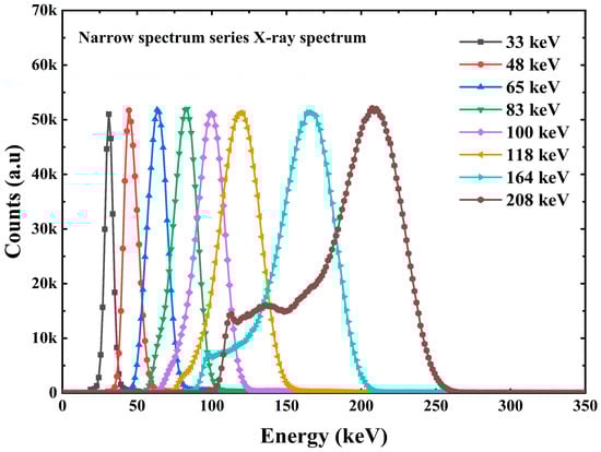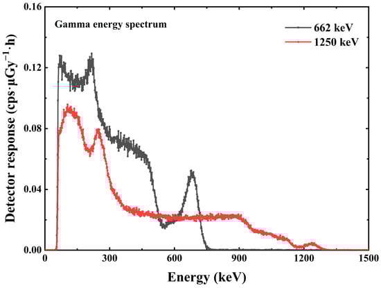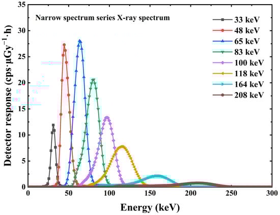 The scale information between the energy and the channel address in the multichannel analyzer allows the conversion of the channel address in the horizontal coordinate to energy. The vertical coordinate in the pulse amplitude spectrum is the counts, which can be converted into the counting rate by the information of the measured spectrum time. The counting rate was divided by the dose rate at the standard position to obtain data on the detection efficiency of the detector at different energies, i.e., the detector response at different energies [19,20]. A total of 10 X/γ ray data measurements covering the energy range of 33 keV–1.25 MeV were completed for the average energy, as shown in Figure 9 and Figure 10.