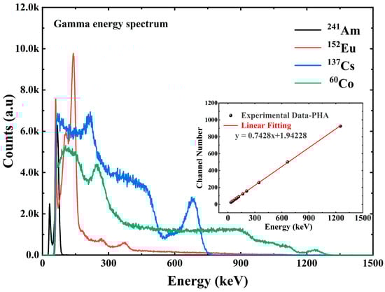 The pulse amplitude spectrum acquired by the multichannel analyzer ORTEC EASY-MCA-8K is shown in Figure 7 and Figure 8. Figure 7 shows the X-ray pulse amplitude, in which we can observe that when the incident X-ray energy reaches 164 keV, the Compton flat appears in front of the X-ray energy spectrum. The interaction between X/γ ray and matter mainly includes the photoelectric effect, Compton scattering, and electron pair effect. For the same substance, the three effects have a certain dependence on the energy of the incident photon. In the case of incident low-energy photons, the photoelectric effect is dominant. As the incident photon energy increases, the Compton scattering effect gradually increases so that we can see the appearance of the platform in the front in the energy spectrum at 164 keV and 208 keV energies. For photons with energy less than 164 keV, the Compton scattering effect is so weak that we cannot see the Compton platform very clearly. Figure 8 shows the γ pulse amplitude spectrum under the γ radiation device. Figure 8 also shows the energy versus channel address scaling information obtained from the peak position information of the full energy peak, which is used to calibrate the linear relationship between channel address and photon energy in the multichannel analyzer ORTEC EASY-MCA-8K.