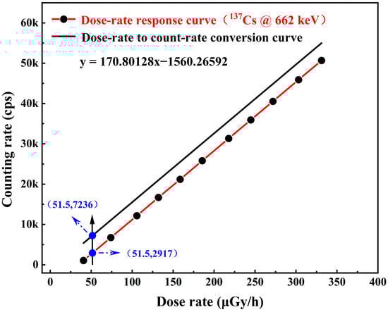The is the correction factor of interval , and is the counting rate of interval . The total counts is obtained by correcting and weighting the counting rates within all partitions. The dose-rate to count-rate conversion function is obtained by fitting and correcting the experimental data of the detector’s dose rate response at 662 keV photons. By positioning the detector at a reference point within the radiation field and varying the dose rate at the detector location by adjusting the distance between the detector and the 137Cs radiation source, the linear response curve of the dose rate versus counting rate of the Cs3Cu2I5:Tl detector at 662 keV was obtained. At this time, under the 662 keV γ photon radiation field, when the Air-absorbed dose rate is 51.5 μGy/h, the counting rate of the detector is 2917 cps. The counting rate value after correction by the PAW method is 7236 cps obtained from Equation (5), and the dose rate response curve of the detector is reset to obtain the conversion function between the counting rate and the dose rate, as shown in the Figure 11.