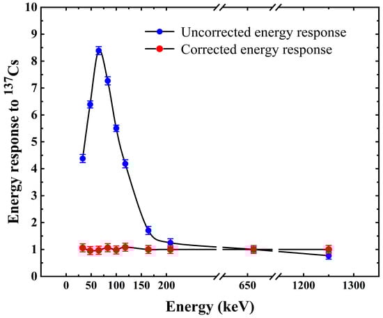 Set the correction coefficients in the energy response real-time correction upper computer software according to Table 4. When the upper computer program captured the valid nuclear pulse waveform data, it first extracted the amplitude, then used the amplitude to determine the energy interval in which the pulse falls, and finally used the set correction coefficients of the energy intervals as the pulse counts, resulting in the correction of the energy response [21], implemented by the LabVIEW program in the host computer and displayed in real time. A total of ten measurements were taken under each energy condition, and the counting rate (counts per second, cps) values in the table are the arithmetic averages of the ten measurements under each energy condition. The relative energy response was calculated from Equation (4).