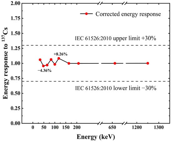 Figure 12 shows the detector response curves before and after energy response correction by the PAW method. Figure 13 shows the detector response error curves at different energies for the Cs3Cu2I5:Tl detector after energy response correction by the PAW method. Figure 13 identifies the maximum allowable error range (±30%) in the standard IEC 61526:2010, and the maximum error of the detector after energy response is 8.26% in the positive direction and 4.36% in the negative direction. The maximum error of the relative photon response of the detector after calibration is 8.26%, which is much better than the ±30% requirement of IEC 61526:2010.