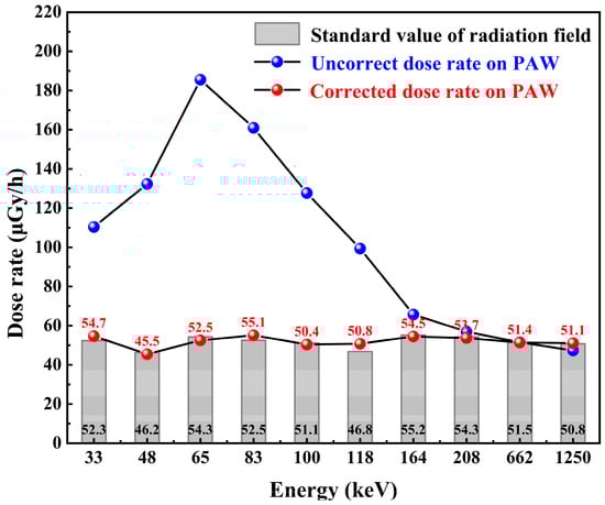 The effect of the energy response correction on PAW is shown in Figure 12 and Figure 13. The uncorrected energy response curve in Figure 12 shows that the photon energy response of the Cs3Cu2I5:Tl detector before energy response correction is inconsistent in the energy range from 33 keV to 1.25 MeV. The detector has severe over-response in the low-energy area. For the Cs3Cu2I5:Tl detector, the response value peaks at photon incidence with an energy of 65 keV. The maximum response difference from low to high energy can be as much as eight times without photon energy response correction, which will seriously affect the accurate measurement of radiation field dose equivalent.