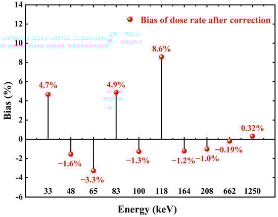 After the energy response correction, regardless of the energy of the incident photon, the count rate of the detector in the radiation field with different energy photons but the same dose rate is equal. That is, the count rate displayed by the detector is linearly related to the dose rate in the radiation field, regardless of the energy, which is the purpose of the PAW method. In this way, we can easily carry out the conversion between the counting and dose rates. There is no need to worry about the measurement error caused by the inconsistent detection efficiency of the detector for different energy photons. Dose rate conversion before and after correction can be performed using the conversion function in Figure 11. Figure 14 shows the measured values before and after correction against the standard values. The relative deviation of the measured dose rate from the radiation field standard values after correction by the PAW method is shown in Figure 15, and the relative deviation of the dose rate is calculated to be in the range of −3.3% to 8.6%.