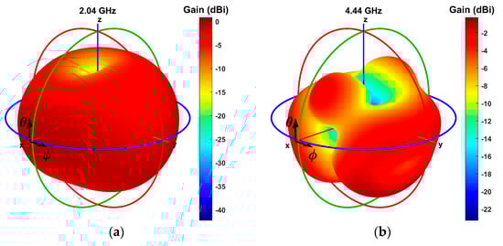 As indicated by Figure 3, the primary resonant frequency for mode 1 is 2 GHz, with a return loss (S11) of −26.4 dB, which is about 9.5 dB lower than the next (secondary) resonance seen at 6.4 GHz. VSWR of the 2 GHz resonance for this mode was equal to 1.11. Subsequently, mode 2 shows a better main resonance at 2.04 GHz frequency than mode 1 in the 2 GHz band. It is characterized by a good return loss of −39.5 dB and a VSWR equal to 1.02. Amongst the three modes, this one has the best resonance in the 4 GHz band, at 4.44 GHz specifically. The return loss for this resonance is −22.3 dB, and the VSWR is 1.17. Finally, mode 3’s primary resonance is found at 6.42 GHz, with an excellent return loss of −60.6 dB, in addition to a very low VSWR found at 1.01 for this resonant frequency. The following, secondary, resonance is seen at 0.91 GHz, with a return loss of about 33.5 dB higher than that of the main resonance. Overall, according to the simulation results, the antenna can operate in the 2, 4, and 6 GHz bands. Mode 2 is the most convenient for operation in the 2 and 4 GHz bands at frequencies of 2.04 and 4.44 GHz, while mode 3 is the best for operation in the 6 GHz band at 6.42 GHz. The −10 dB defined bandwidth for the frequencies 2.04, 4.44, and 6.42 GHz is 211, 941, and 452 MHz, respectively. The radiation patterns for these three cases are depicted in Figure 4, where the positive x-axis extends towards the front direction of the antenna. The azimuth angle will be referred to as φ, while the elevation angle as θ. Both are 0° at the antenna’s front while 180° at the back.