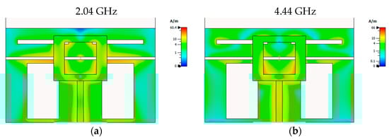 Simulated surface current distribution for frequencies (a) 2.04 GHz, (b) 4.44 GHz, and (c) 6.42 GHz.
